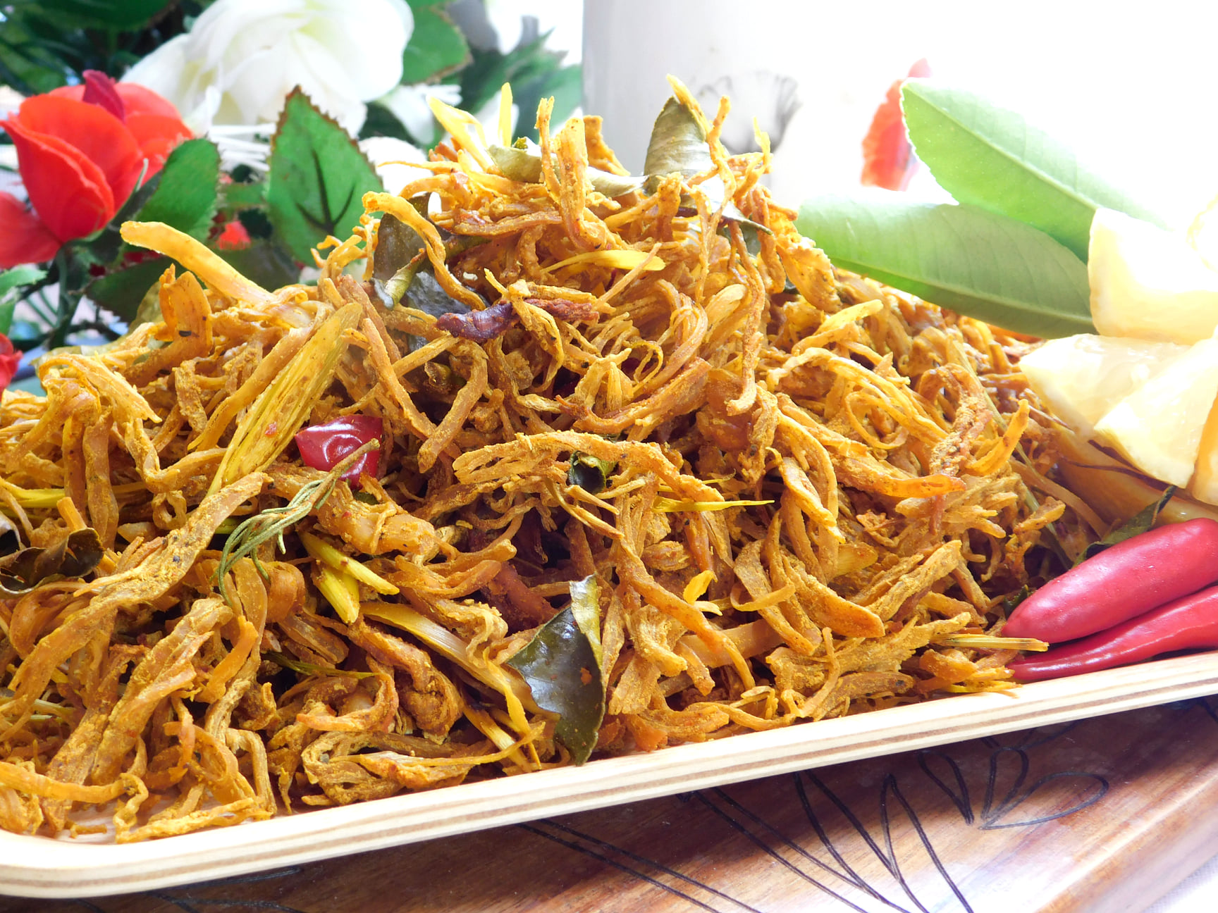 Bước 3: Để thịt nguội bớt trước khi xé sợi nhỏ cho vào âu (lấy lại sả + gừng và nước nướng/hấp thịt) trộn cùng với lá chanh + ớt và gia vị để 2-3 tiếng trong ngăn mát tủ lạnh, hoặc để qua đêm. Thời gian để lâu như thế sẽ giúp nước ướp thịt ngấm hết vào thịt giúp khô gà đậm đà hơn.