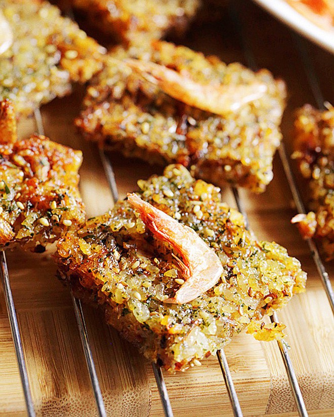 Bữa sáng sẽ thú vị và đã miệng hơn nhiều với cơm nướng tép giòn ngon nứt vách. Miếng cơm giòn rụm, thơm lừng, đượm cái bùi béo của vừng và tôm nướng hấp dẫn. Có thể chấm kèm tương ớt hay sốt mayonaise nếu bạn thích.