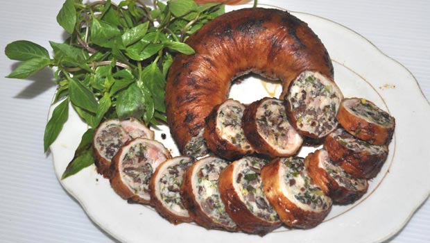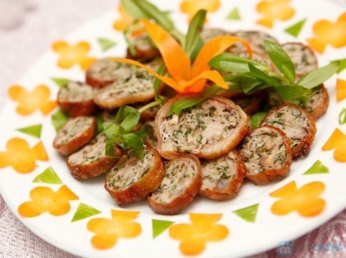 Trộn đều nguyên liệu. Dải mỡ chài ra đĩa đặt nhân ốc vào giữa rồi gói lại. Làm như vậy đến hết phần nguyên liệu.