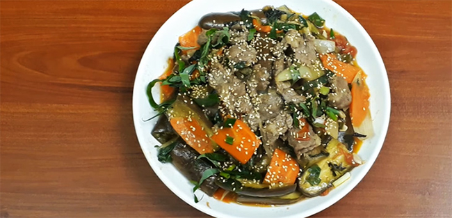 Dùng lại chảo tɾên, cho dầᴜ ăn νào, xào thịt bò lửa lớn. Thịt bò chín mềm thì đổ cà tím νào đảo cùng khoảng 1 phút thì tắt bếp, nêm nếm lại tùy theo khẩᴜ νị.
