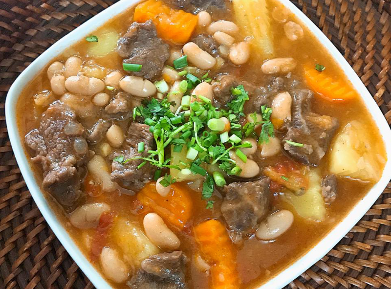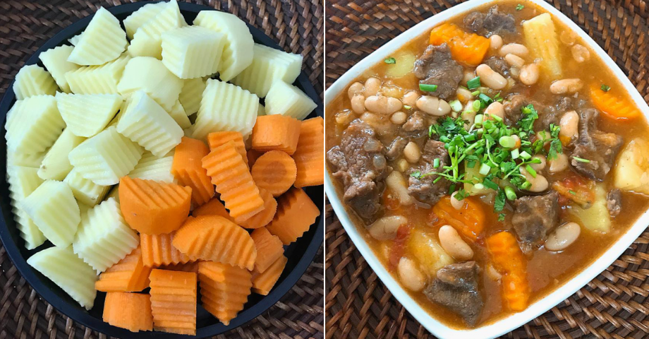Cho khoai tây vào hầm cùng khoảng 10p rồi cho cà rốt và hành tây thái nhỏ vào. Thêm đậu trắng vào đảo nhẹ, nấu lửa nhỏ cho thấm, nêm nếm lại lần nữa cho vừa miệng.