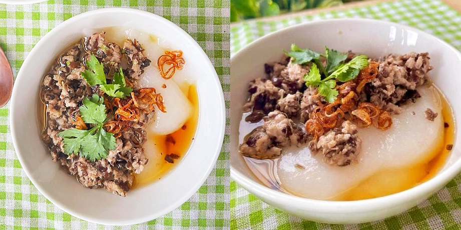 Cuối cùng bạn cho bột bánh, nhân thịt và đậu xanh vào chén. Rưới dầu hành và nước mắm lên trên cùng là đã hoàn thành món bánh đúc nóng từ cơm nguội thơm ngon rồi!