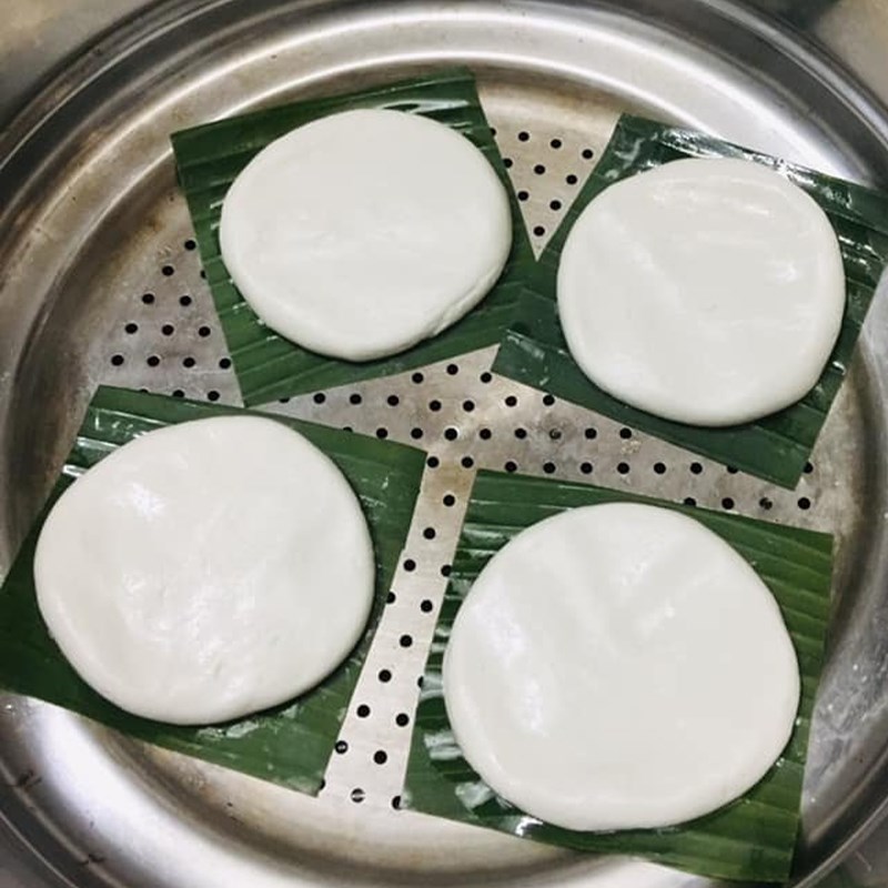 Cắt lá chuối thành từng miếng tròn rồi phết dầu ăn lên. Sau đó, múc 1 lượng bột vừa ăn vo tròn và ấn dẹt đặt lên lá chuối rồi đem hấp trong 15 phút.