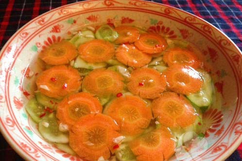 Cà rốt và đu đủ đã được thái lát mỏng vừa ăn cho vào thau, bạn bóp đều tất cả với 1 muỗng muối. Để cà rốt và đu đủ seo lại, sau đó bóp ráo nước. Vắt ráo cà rốt và đu đủ rồi cho vào tô, trộn với một chút giấm ăn, đường, tỏi ớt băm nhỏ, để cho ngấm. Có thể thay thế đu đủ bằng su hào hoặc dưa leo đều được.