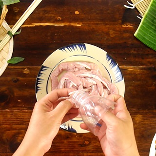 Lòng non hoặc khấu đuôi sơ chế sạch bằng cách tuốt sach, rửa lại nhiều lần với nước, bóp muối và chanh, nước cuối cùng nóp thêm mắm và rửa lại với nước sạch, để ráo rồi đem nhồi hỗn hợp sụn đã ướp vào. Buộc thành từng khúc ngắn để khi nướng sẽ dễ dàng và đẹp mắt.