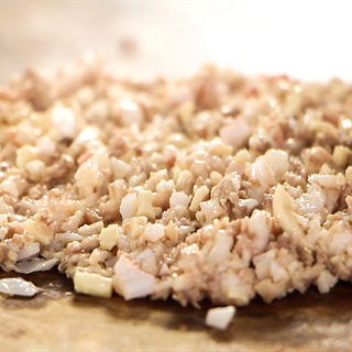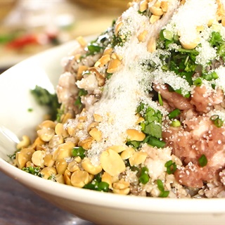 Sườn sụn non rửa sạch, để ráo, bằm thật nhỏ. Hành khô bóc vỏ, thái hạt lựu, rau húng quế rửa sạch (cho nhiều thì dồi càng thơm ngon) vảy sạch nước, thái nhỏ. Trộn 3 nguyên liệu cùng hạt nêm, tiêu và chút mắm ngon. Cất tủ lạnh ít nhất 30 phút cho ngấm đều gia vị.