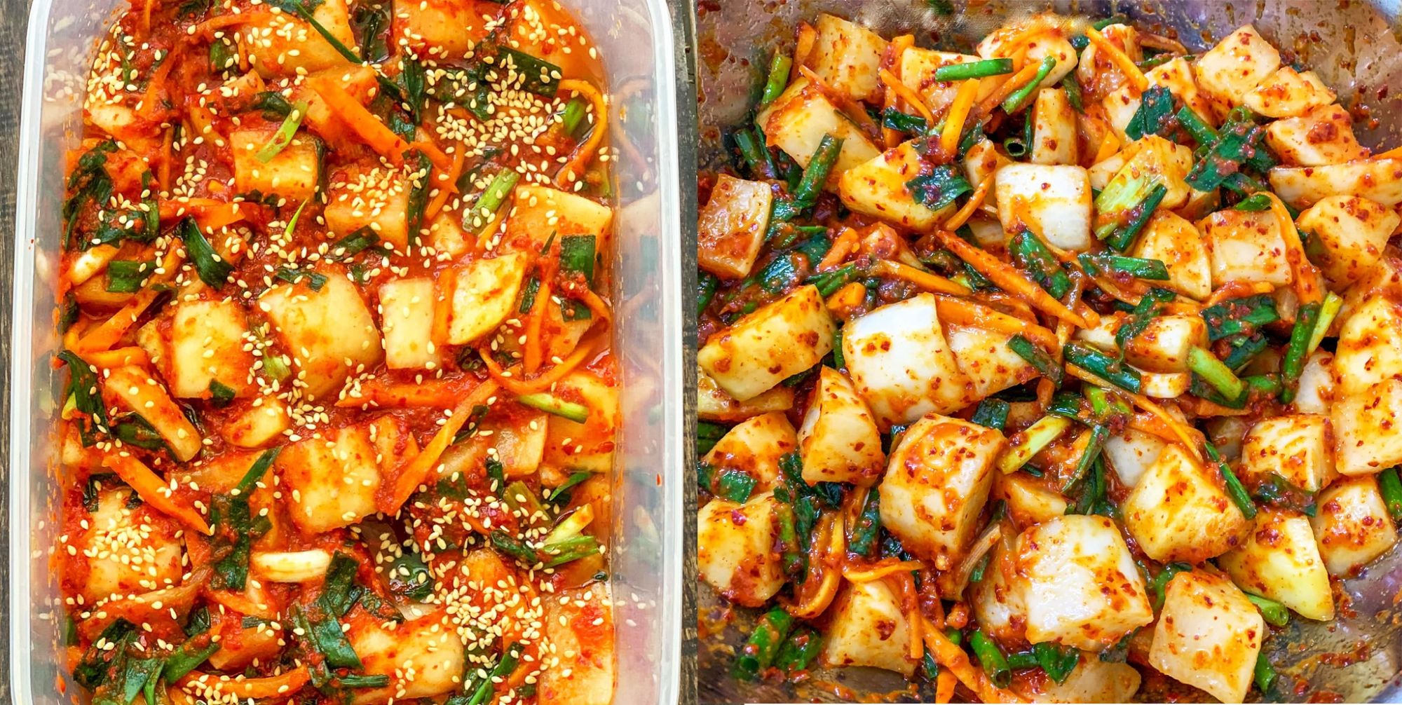 So với kim chi cải thảo thì kim chi củ cải làm nhanh hơn nhiều. Vì không mất công rửa từng bẹ lá, cũng không phải nhồi nhân giữa các lớp lá. Củ cải lại vừa giòn vừa ngọt. Ăn không cũng ngon rồi, nhưng tuyệt nhất là đem nấu canh, chẳng bao giờ sợ rau bị nát hay nhũn.