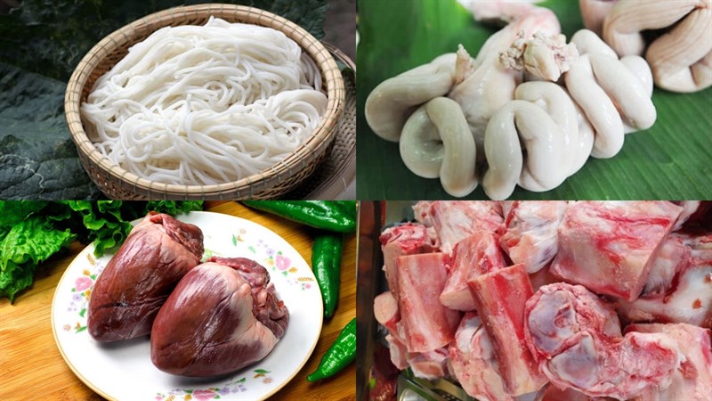 Tim heo 1 quả (khoảng 300gr), gan heo 100 gr, dồi trường 400 gr, bao tử heo 400 gr, xương ống 1 kg