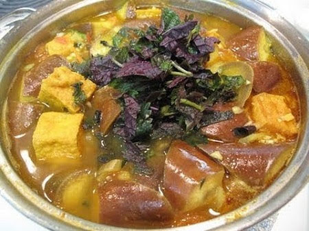 Cà bung nấu thịt ba chỉ cho bạn món ăn có vị ngọt mềm của thịt, vị béo của đậu, vị chua dịu cực hấp dẫn của mẻ cùng với mùi thơm đặc trưng của lá lốt, tía tô và xương sông cực kỳ hấp dẫn.
