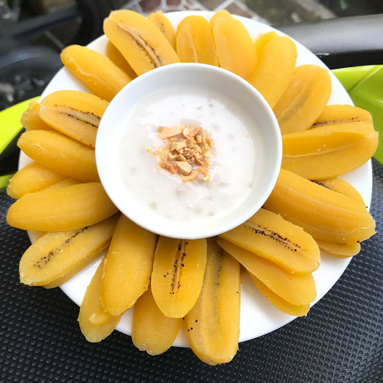 Cho chuối xắt miếng vào dĩa, chan nước cốt dừa vào, rắc đậu phộng rang giã nhỏ. Chuối xào dừa ngon được là tùy theo ý thích từng gia đình khi nấu nước cốt dừa, có thể thêm hay bớt đường cho vừa khẩu vị. Vị ngọt của chuối, vị béo của nước cốt dừa, thơm thơm của đậu phộng rang. Tất cả hòa quyện, làm nên một món chuối xào dừa giản dị, dân dã mà đắm say lòng người.