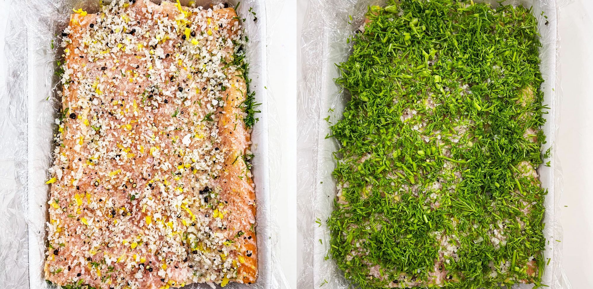 Trải miếng màng bọc thực phẩm nilon lên cái khay sâu lòng, nên trải vài lớp, hơi chồng lên nhau, thái thìa là nhỏ, rắc một lớp dày phía dưới, tiếp theo là lớp hỗn hợp muối ướp, sau đó đặt miếng cá lên trên, phía trên miếng cá cũng rắc một lớp muối ướp, một lớp lá thìa là thái nhỏ, bọc kín miếng cá hồi lại, dùng vật nặng đè lên trên, cất ngăn mát tủ lạnh.