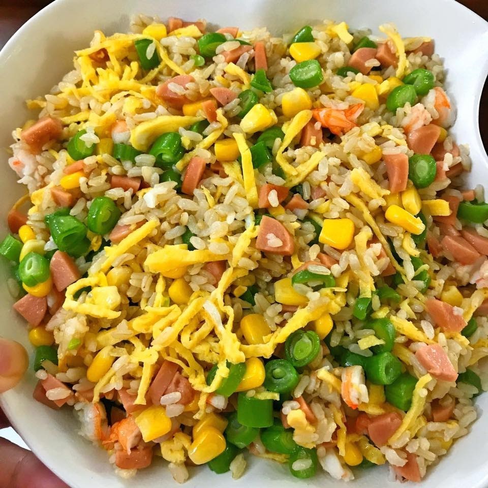 Phi thơm hành, đổ cơm vào trước,đ ảo cho hơi săn tiếp tục cho xúc xích hoặc lạp sườn vào, ngô ngọt đậu đũa, tôm đảo thật đều, cho chút nước mắmvào cho thật thơm, nếu không ăn nước mắm cho bột nêm hoặc bột canh, thêm chút hạt tiêu, sau cùng đổ trứng vào trộn đều một lần nữa rồi đổ ra đĩa.
