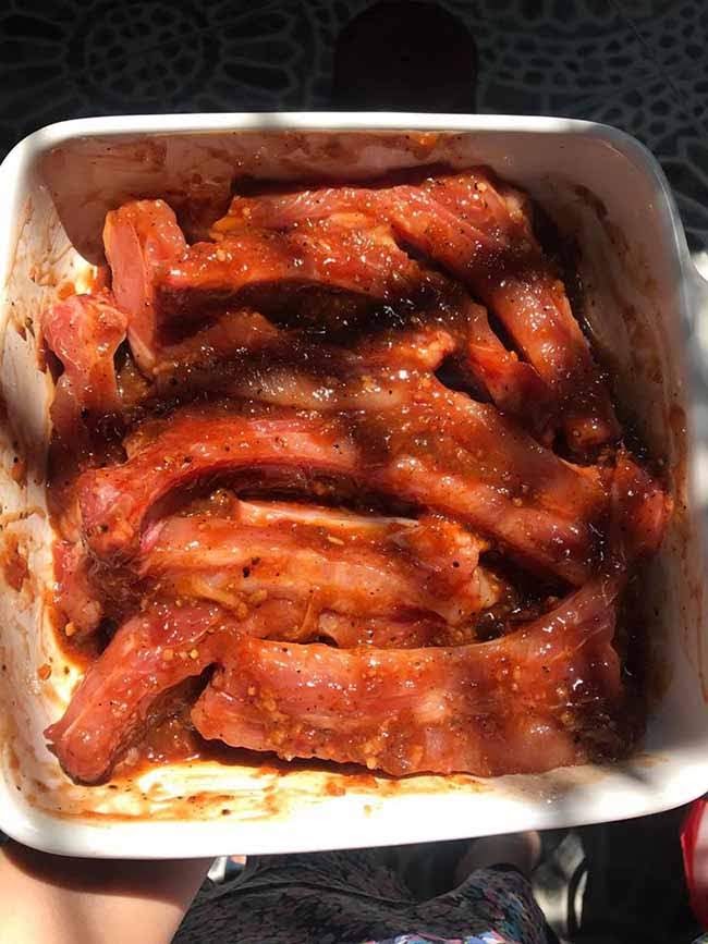 Sườn non rửa sạch, bóc phần màng mỏng phía dưới để sườn dễ ngấm sốt hơn. Sườn có thể để nguyên tảng, hoặc cắt thành từng miếng nhỏ.