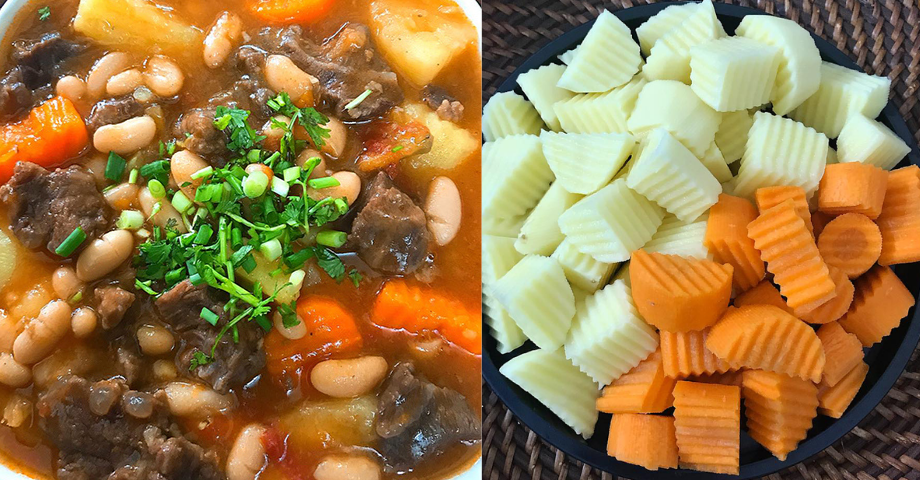 Cho khoai tây vào hầm cùng khoảng 10p rồi cho cà rốt và hành tây thái nhỏ vào. Thêm đậu trắng vào đảo nhẹ, nấu lửa nhỏ cho thấm, nêm nếm lại lần nữa cho vừa miệng.
