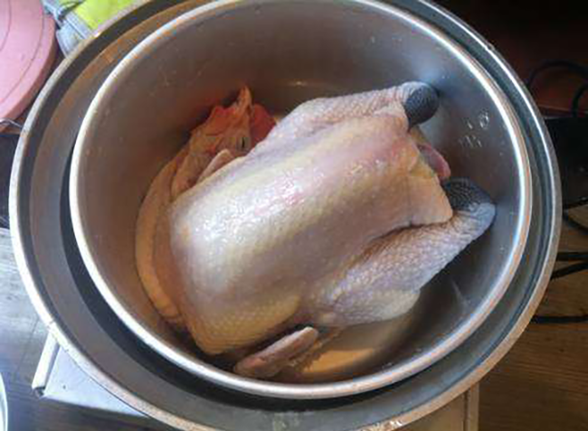 Gà rửa sạch rồi cho tỏi và trong, chuẩn bị nồi sắt.