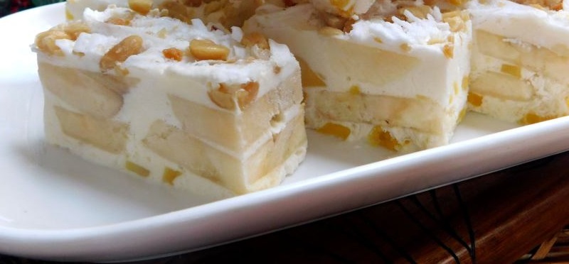 Bước 3: Cho ít kem (bước 2) vào khay/khuôn nhỏ. Sau đó cho mít và xếp chuối, tiếp đến là kem, cứ thế đổ đầy khuôn và lớp cuối cùng PHẢI là kem. Bây giờ rắc đậu phụng và dừa non đầy mặt.