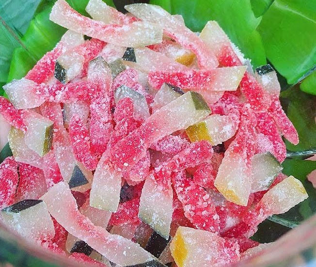 Màu đỏ đặc trưng của ruột dưa chính là màu đại diện cho sự may mắn vào năm mới. Cùng với cùi dưa trắng tinh giòn tan và lớp vỏ xanh mát dai dai lạ miệng bên ngoài, chắc chắn sẽ khiến bất kỳ ai nhìn vào cũng khó mà cưỡng lại được. Mứt dưa hấu có vị ngọt thanh nhẹ nhàng, rất phù hợp để đem ra nhâm nhi tiếp khách vào các dịp lễ Tết.