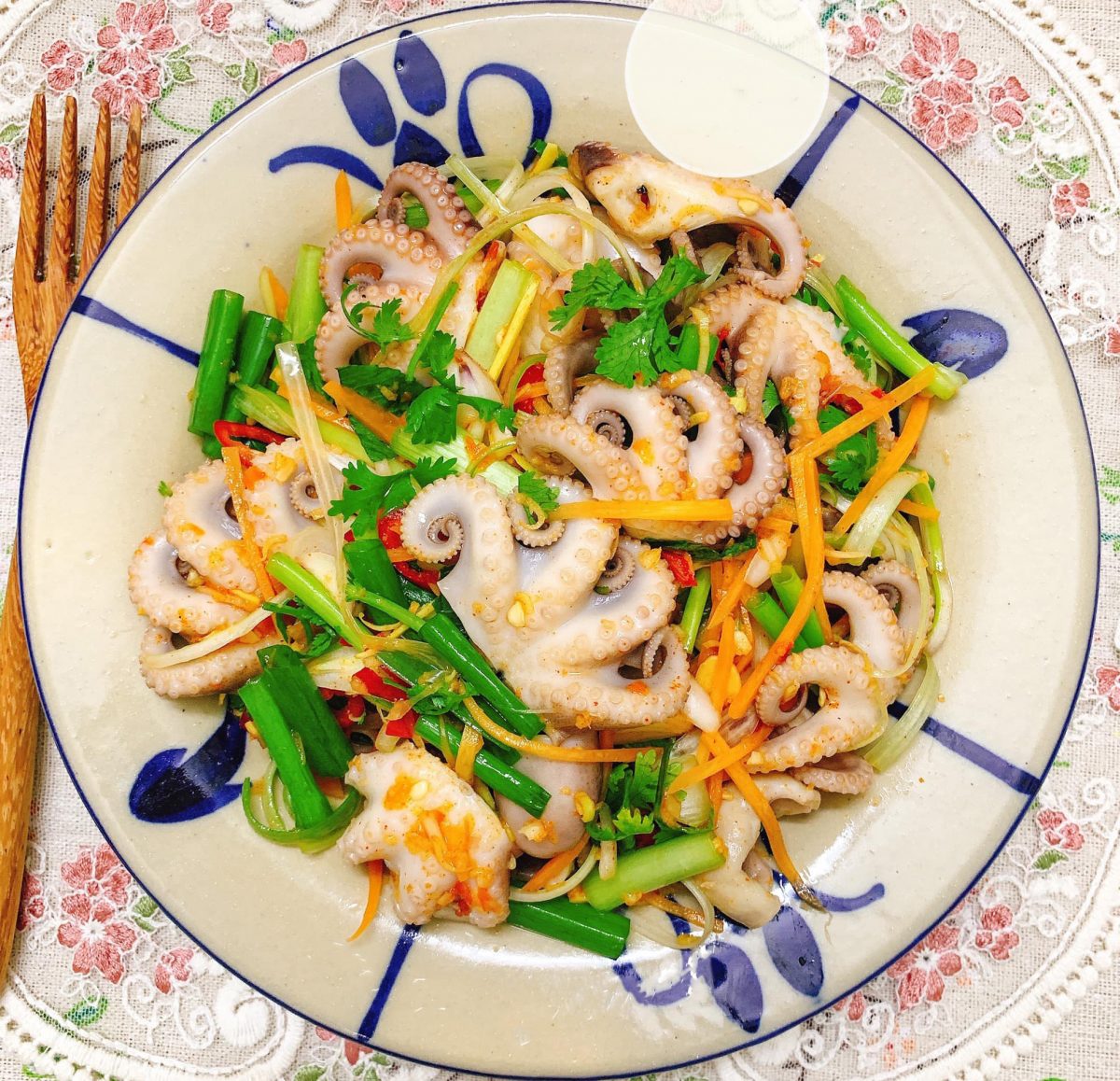 Mọi người có thể cho thêm vài quả cà chua bi cắt đôi, thêm ít miến và ít lạc rang là thành món gỏi miến bạch tuộc giống của Thái Lan đó.