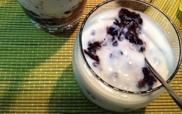 Bước 4: Múc nếp cẩm ra cốc, thêm 1 cốc sữa chua lên trên, tiếp đến là lớp nước cốt dừa và chút đá là có thể thưởng thức.