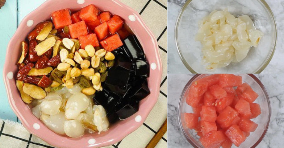 – Vải lấy phần cùi. Dưa hấu thái hạt lựu. Táo đỏ thái lát.