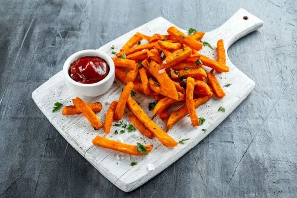 - Khoai lang chiên nên ăn nòng chấm cùng tương ớt cay cay